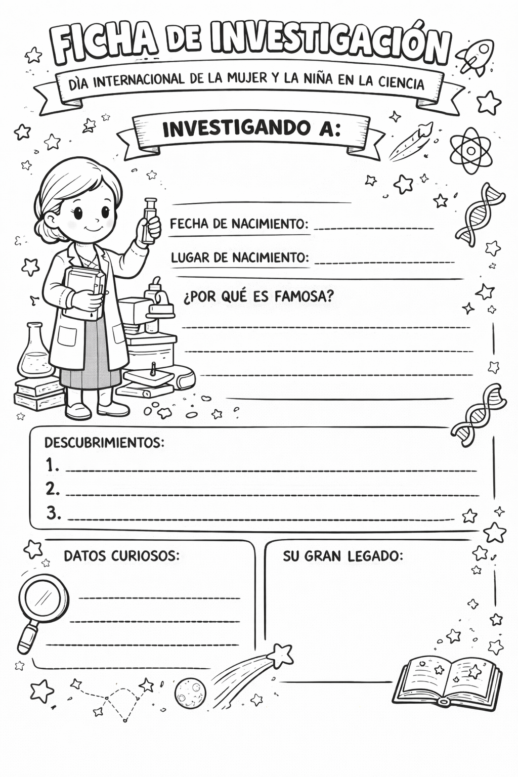 El Día de la Mujer y la Niña en la Ciencia es una fecha ideal para inspirar al alumnado con historias reales, actividades creativas y experimentos seguros. Con fichas y dibujos para colorear sobre Marie Curie, Barbara McClintock y Caroline Herschel, profes y familias pueden trabajar ciencia, valores y lenguaje en una misma propuesta. Si se acompaña de materiales básicos como cartulinas, rotuladores y lápices de colores, el taller queda completo, motivador y muy fácil de aplicar.