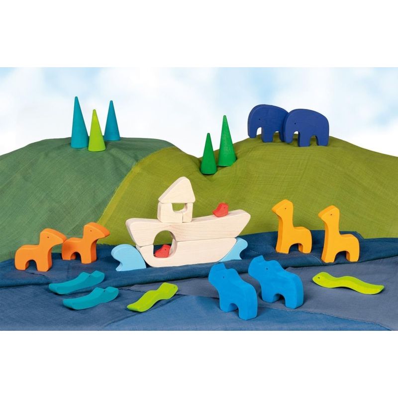 - 21 piezas de madera de gran tamaño: Arca 7 pares de animales, ondas.