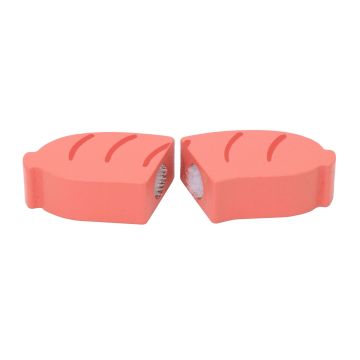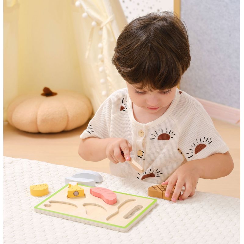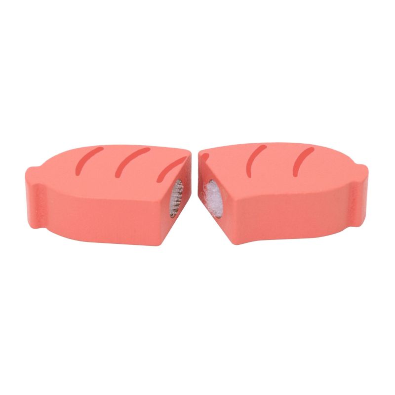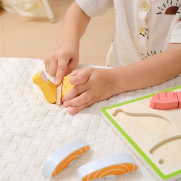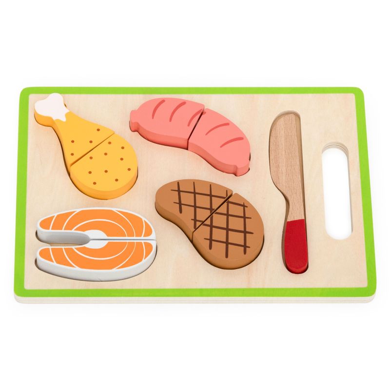 - Incluye: salmón, pollo, filete y salchicha. Todos divididos en dos partes que se unen con velcro.