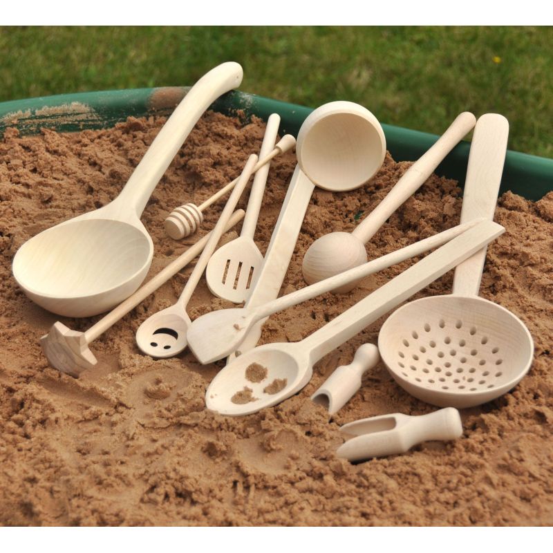 - Utensilios realizados en madera natural con diferentes tamaños.