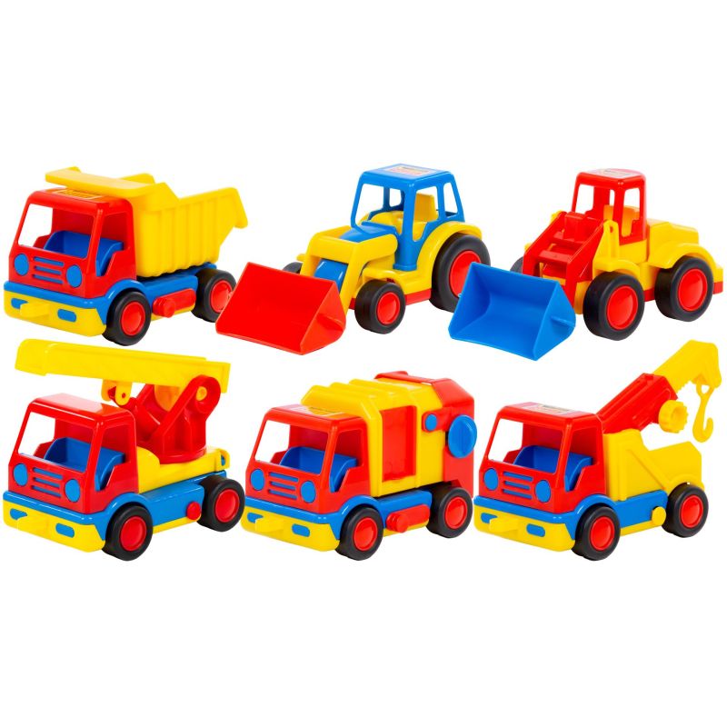 - Set con diferentes tipos de vehículo: camión de basura, camión con gancho, camión con escalera, camión con volquete abatible y 2 excavadoras con pala articulada.