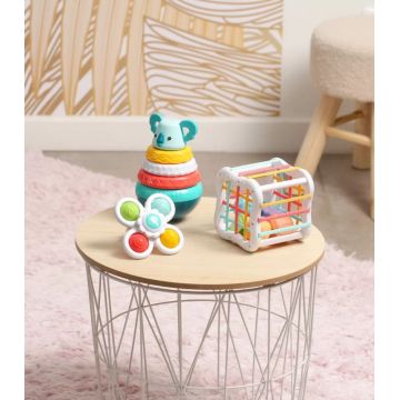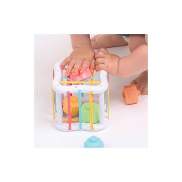 - Con el cubo de manipulación podrás meter y sacar los diferentes bloques, que además encajan entre sí para poder hacer construcciones.