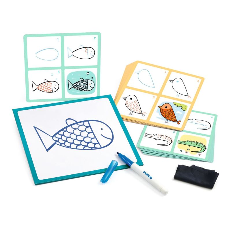 ¡Saca el artista que llevas dentro y aprende a dibujar paso a paso animales! - Fomenta la imaginación y la creatividad. - Desarrolla la coordinación y la motricidad. - Estimula la concentración y la observación. - Sigue los modelos paso a paso, a partir de formas sencillas para completar los diferentes animales. Especificaciones: Edad recomendada: de 3 a 6 años. Contenido: 25 modelos plastificados de 15 cm x 15 cm. Base borrable. Rotulador borrable.