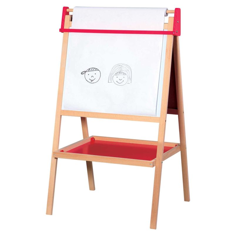 - Caballete compuesto por: pizarra para tiza, pizarra magnética, bandeja de madera, rollo de papel, borrador y paquete de tizas.