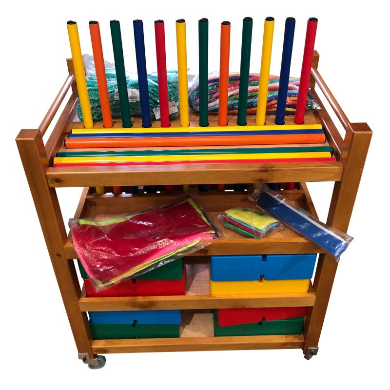 203068: Contiene: - 10 aros de 36 cm. - 12 aros de 50 cm. - 12 aros de 61 cm. - Juego de 8 manos de 15 cm. y 8 pies de 19 cm. antideslizantes. - 10 picas de 1 metro. - 5 picas de 70 cm. - 4 saquetes de colores de 12 cm. de 100 gr. -6 soportes de aro/pic de 30x15x10 cm. - 5 cintas raso de 3 metros. - 3 cuerdas verdes de polipropileno de 10 metros y 9 mm. de grosor. -10 cuerdas en nailon de 3 metros de longitud y 9 mm. de grosor. Carro de 95x78x52 cm. realizado en madera de pino barnizado con apartados para clasificar los materiales. Con ruedas para facilitar su transporte.